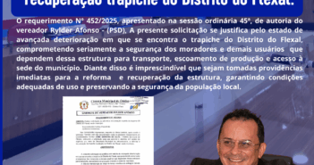 O requerimento N° 452/2025, apresentado na sessão ordinária 45ª, de autoria do vereador Rylder Afonso – (PSD), A presente solicitação…