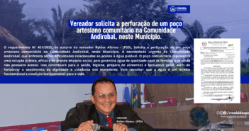 O requerimento N° 451/2025, de autoria do vereador Rylder Afonso – (PSD), Solicita a perfuração de um poço artesiano comunitário…