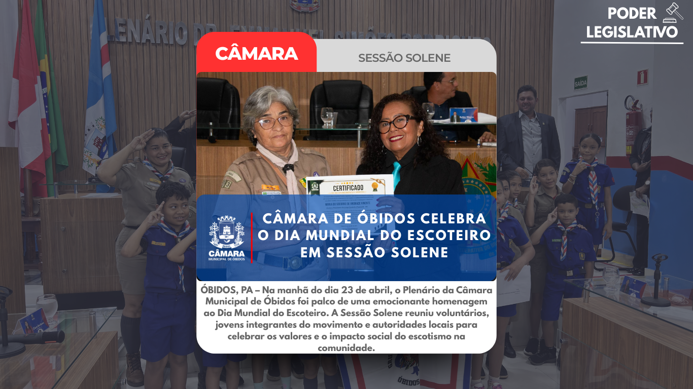 ÓBIDOS, PA – Na manhã do dia 23 de abril, o Plenário da Câmara Municipal de Óbidos foi palco de uma emocionante homenagem ao Dia Mundial do Escoteiro. A Sessão Solene reuniu voluntários, jovens integrantes do movimento e autoridades locais para celebrar os valores e o impacto social do escotismo na comunidade.